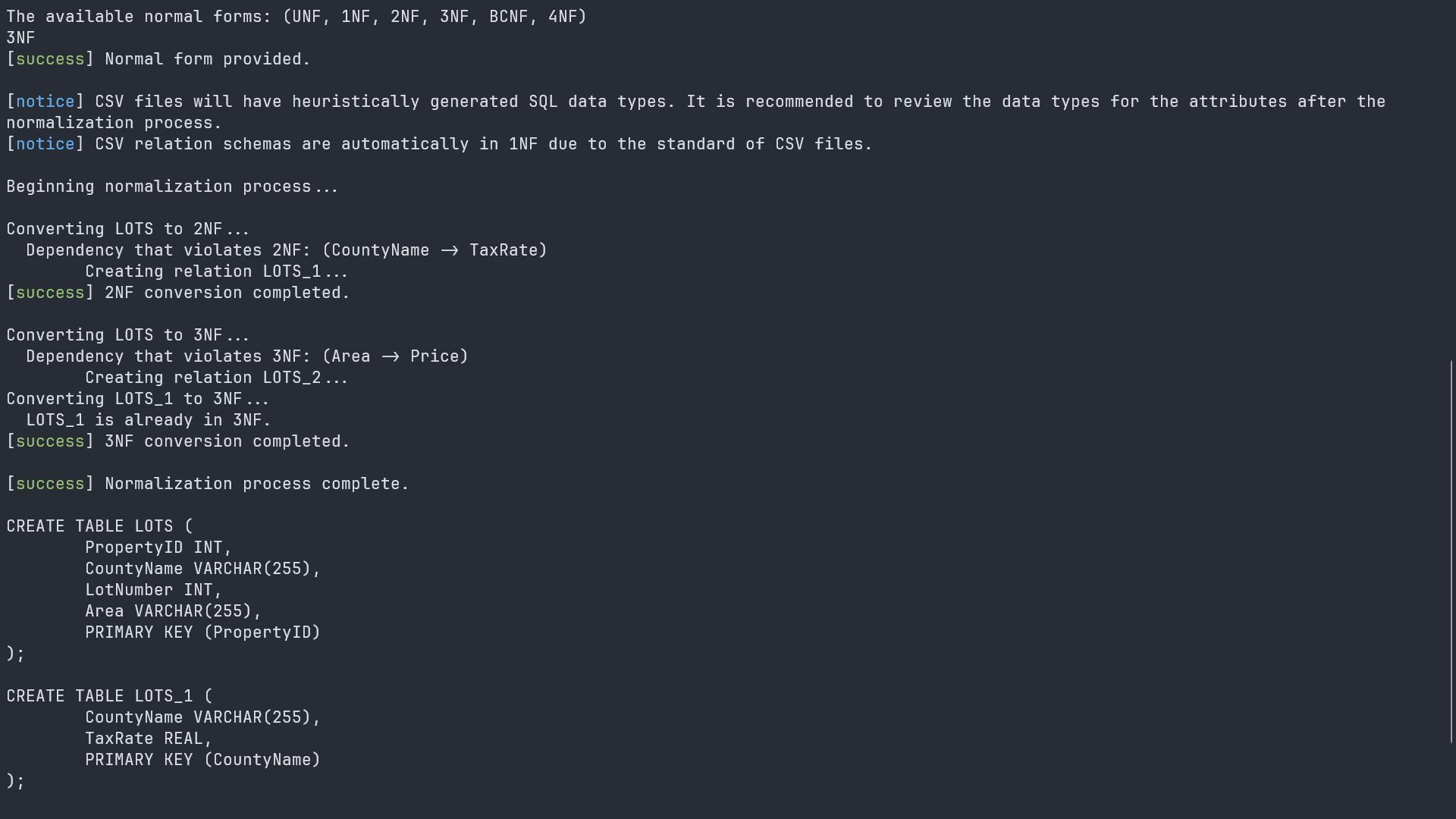 A Python script that takes a relation schema and its constraints as input, normalizes the schema to a desired normal form, and outputs the necessary SQL statements to generate the normalized relation schemas. This was an assignment for COMP SCI 5300 at Missouri S&T.